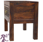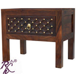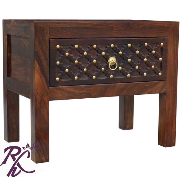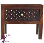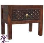 This Brass bedside crafted from solid wood is perfect to create a warm traditional look for any bedroom décor. Detailed brass work with walnut finish creates a complete blend for traditional décor. Available with spacious pull out drawer and closed shelf. This can be placed in the bedroom or even in the living room.