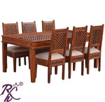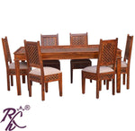 The Wooden Jiksa Jali Dining Set 6 Seater. This wooden Dining table and chairs are made up of Sheesham wood so that the life of the furniture stays for long. It is termite-proof and polished with melamine. There are more finishes Walnut, Honey, and Natural as well to choose from. You can use this Dining table with 6 Chairs for Dining Room. The Top Design of This Wooden Dining Table Also Gives It New Look. Made with premium quality Sheesham wood. this Wooden Solid Wooden Dining Table With 6 Chairs will add warmth and going to be a worthy winner in your Dining Room. it’s a perfect fit for almost any type of interior. make you feel comfortable. this beautiful Dining table with 6 Chairs makes your house become elegant. Now available at a very effective price.