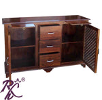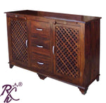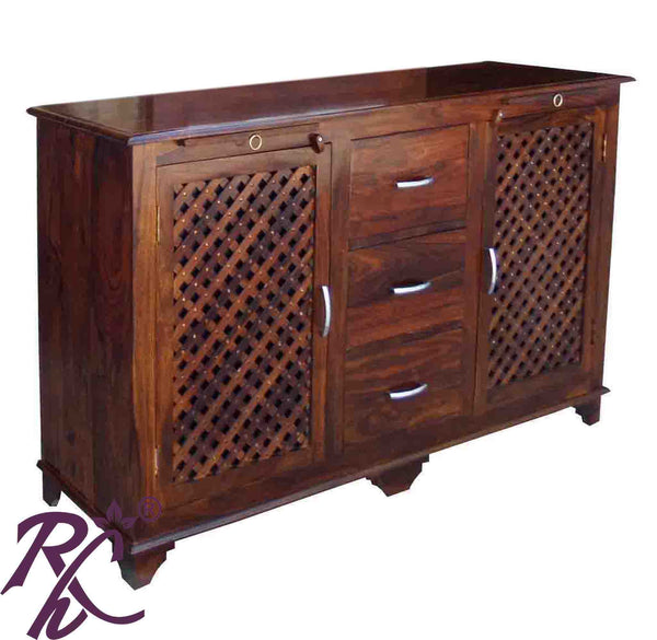 The Solid Wood Ferna Sideboard Wooden Jali 2 Doors, 3 Drawers. This wooden Sideboard is made up of Sheesham wood so that the life of the furniture stays for long. It is termite-proof and polished with melamine. There are more finishes of it walnut, honey, natural and many more to choose from. A perfect fit for almost any type of interior, room and hall. It has enough space to store your things. This sideboard has three drawers and two doors. So, this sideboard is available now at a very effective price.