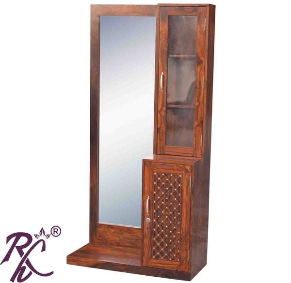 The Solid Wooden Jiksa Jali Design Dresser With Stool. This wooden Dresser is made up of Sheesham wood so that the life of the furniture stays for long. It is termite-proof...