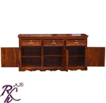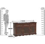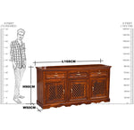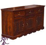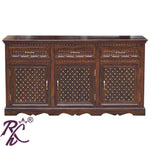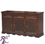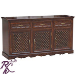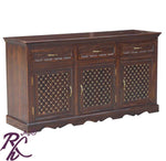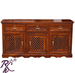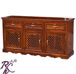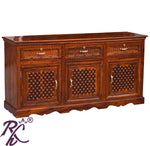 The Solid Wooden Jiksa Jali Design Sideboard. This wooden Sideboard is made up of Sheesham wood so that the life of the furniture stays for long. It is termite-proof and polished with melamine. There are more finishes of Walnut, Honey, and Natural as well to choose from. You can use this sideboard and storage for a Dining room and any room in your home. this Wooden Solid Wood Sideboard Cabinet will add warmth and going to be a worthy winner in your home. it’s a perfect fit for almost any type of interior. make you feel comfortable. this beautiful sideboard makes your house become elegant. the gives you ample storage space. Three drawers and Three Doors, Now available at a very effective price.